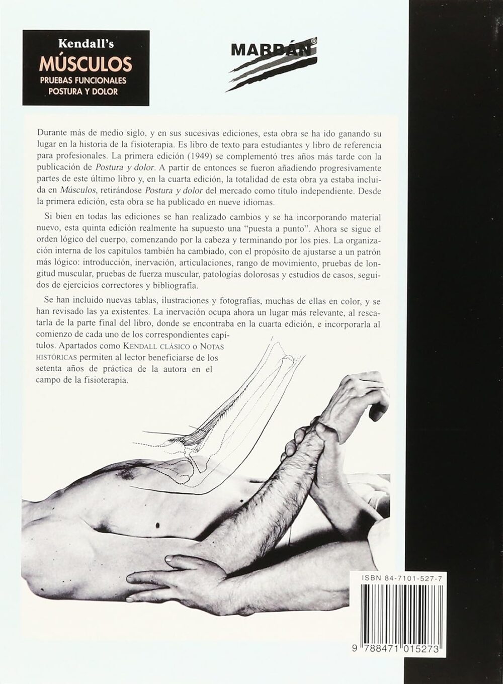 Durante más de medio siglo el “KENDALL MÚSCULOS” ha ido ganando su lugar en la historia de la Rehabilitación y de la Fisioterapia. Es libro de texto para estudiantes y referencia para profesionales. La primera edición de 1949 se complementó tres años más tarde con la publicación de “Postura y dolor”. A partir de entonces se fueron añadiendo progresivamente partes de este último libro y, en la cuarta edición, la totalidad de esta obra ya estaba incluida en “Músculos” retirándose “Postura y dolor” del mercado como título independiente. Desde su primera edición se ha publicado en nueve idiomas. Si bien en todas las ediciones se han realizado cambios y se ha incorporando material nuevo, esta quinta edición realmente ha supuesto una “puesta a punto” . Ahora se sigue el orden lógico del cuerpo, comenzando por la cabeza y terminando por los pies. La organización interna de los capítulos también ha cambiado, con el propósito de ajustarse a un patrón más lógico: introducción, inervación, articulaciones, rango de movimiento, pruebas de longitud muscular, pruebas de fuerza muscular, patologías dolorosas y estudios de casos, seguidos de ejercicios correctores y bibliografía. Se han incluido nuevas tablas, ilustraciones y fotografías, muchas de ellas en color, y se han revisado las ya existentes. La inervación ocupa ahora un lugar más relevante, al rescatarla de la parte final del libro, donde se encontraba en la cuarta edición, e incorporarla al comienzo de cada uno de los correspondientes capítulos.